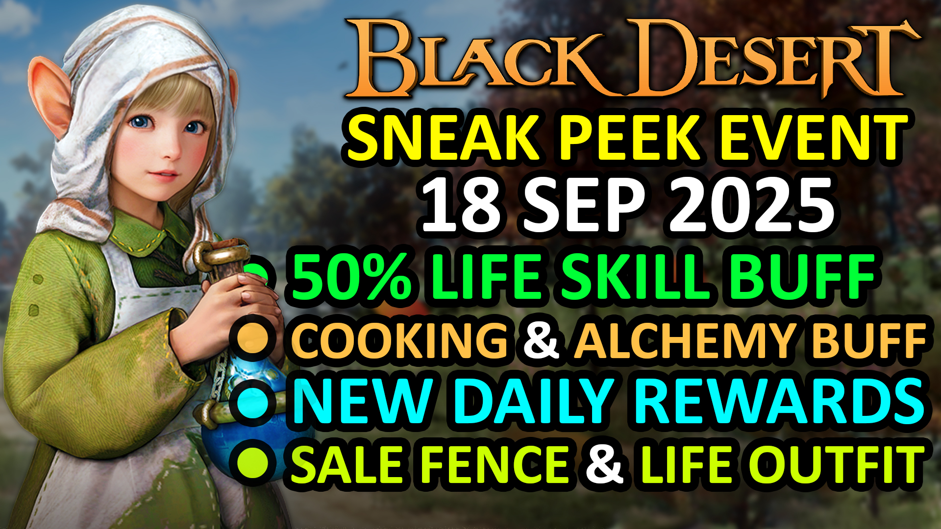 This Video About 50% LIFE SKILL BUFF, COOKING & ALCHEMY BUFF, NEW DAILY LOGIN REWARDS, SALE FENCE & LIFE OUTFIT (Black Desert Online Sneak Peek Event 18 SEPTEMBER 2025) BDO