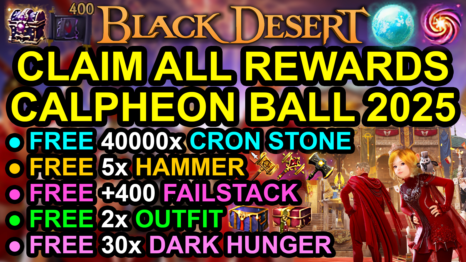 This Post about FREE 40000 CRON, 2x OUTFIT, 5x HAMMER, +400 FAILSTACK, 30x DARK HUNGER, CLAIM ALL REWARDS CALPHEON BALL 2025 (BLACK DESERT ONLINE) BDO