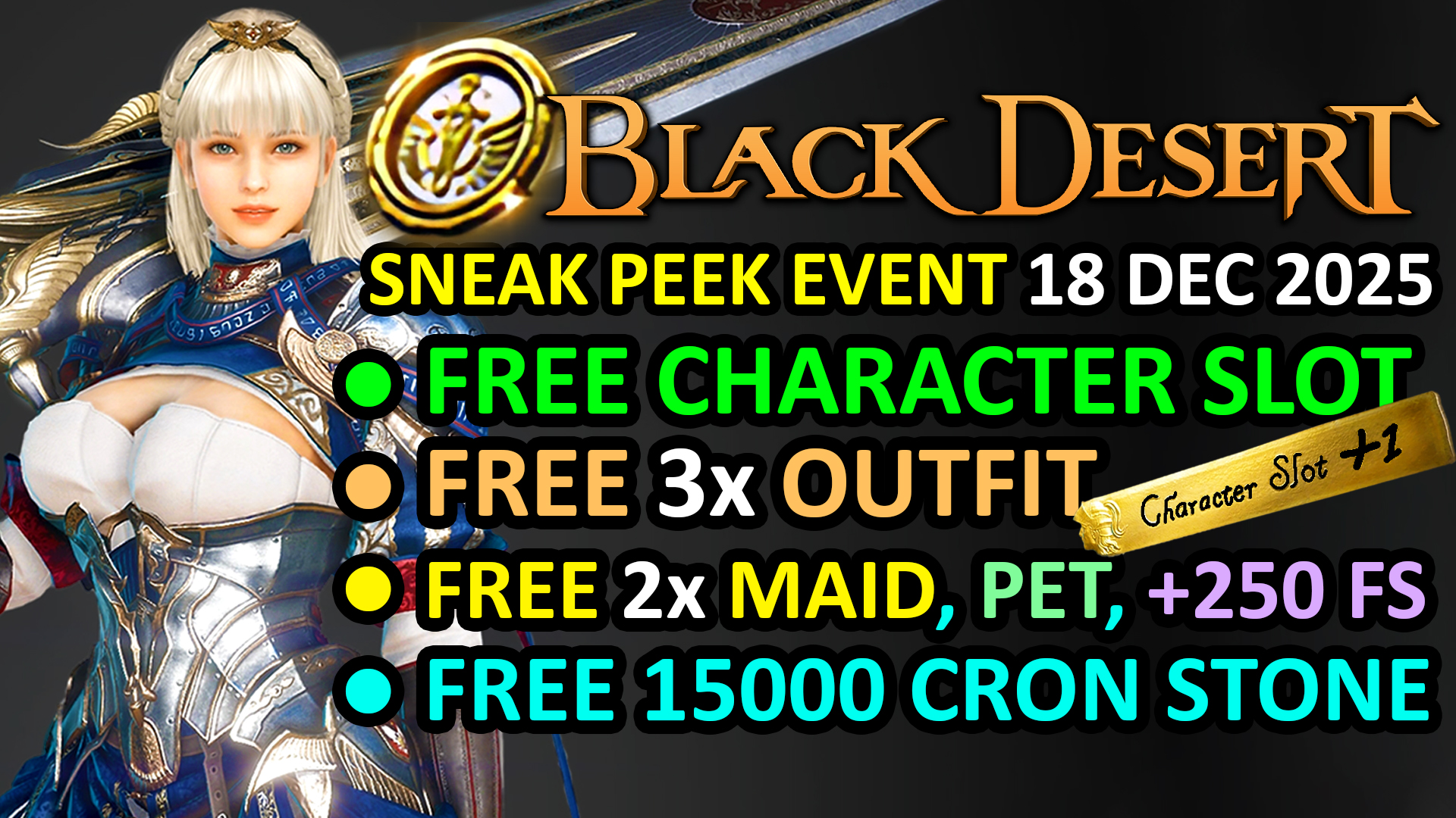 This Post about FREE CHAR SLOT EXPANSION, FREE 3x OUTFIT, 2x MAID, VALUE PACK, PET, 15000 CRON, +250 FS (Black Desert Online Sneak Peek Event 18 DECEMBER 2025) BDO