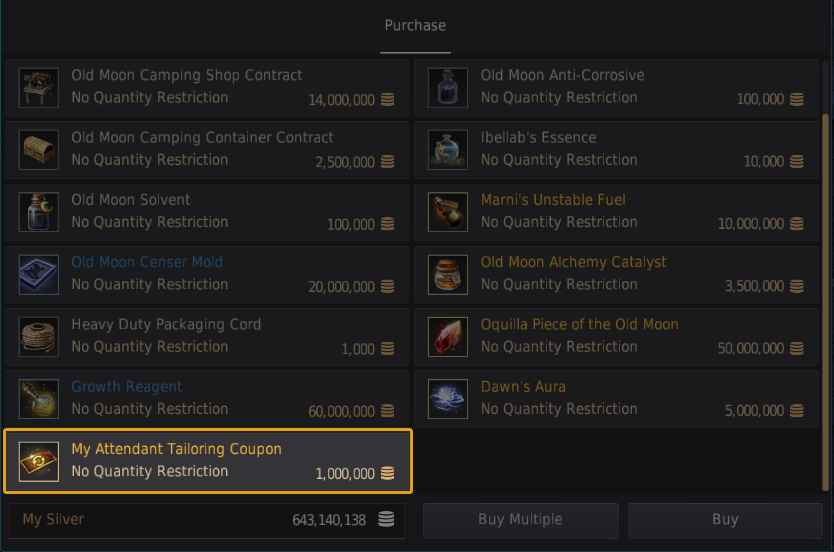 - The coupon can be purchased from any Old Moon Manager in towns and major cities (1,000,000 Silver).