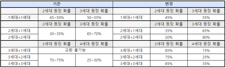 일대일 교환을 했을 때의 확률인데요, 변경되는 방식에서는 상위 세대가 등장 확률은 반려동물을 추가할수록 높아집니다.